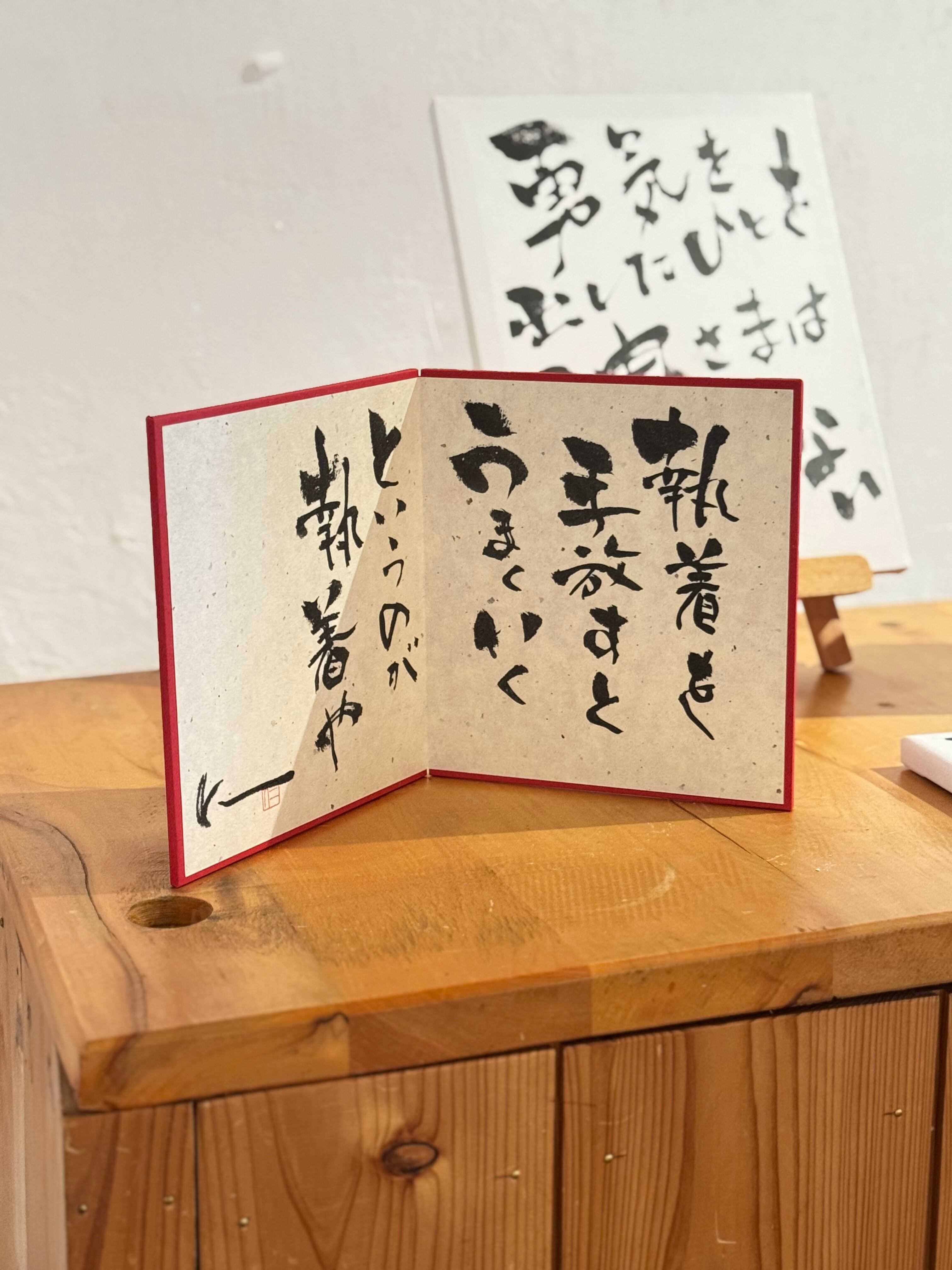 紙屏風に、Jinからあふれ出る魔法の言葉を一枚一枚手書きしています。