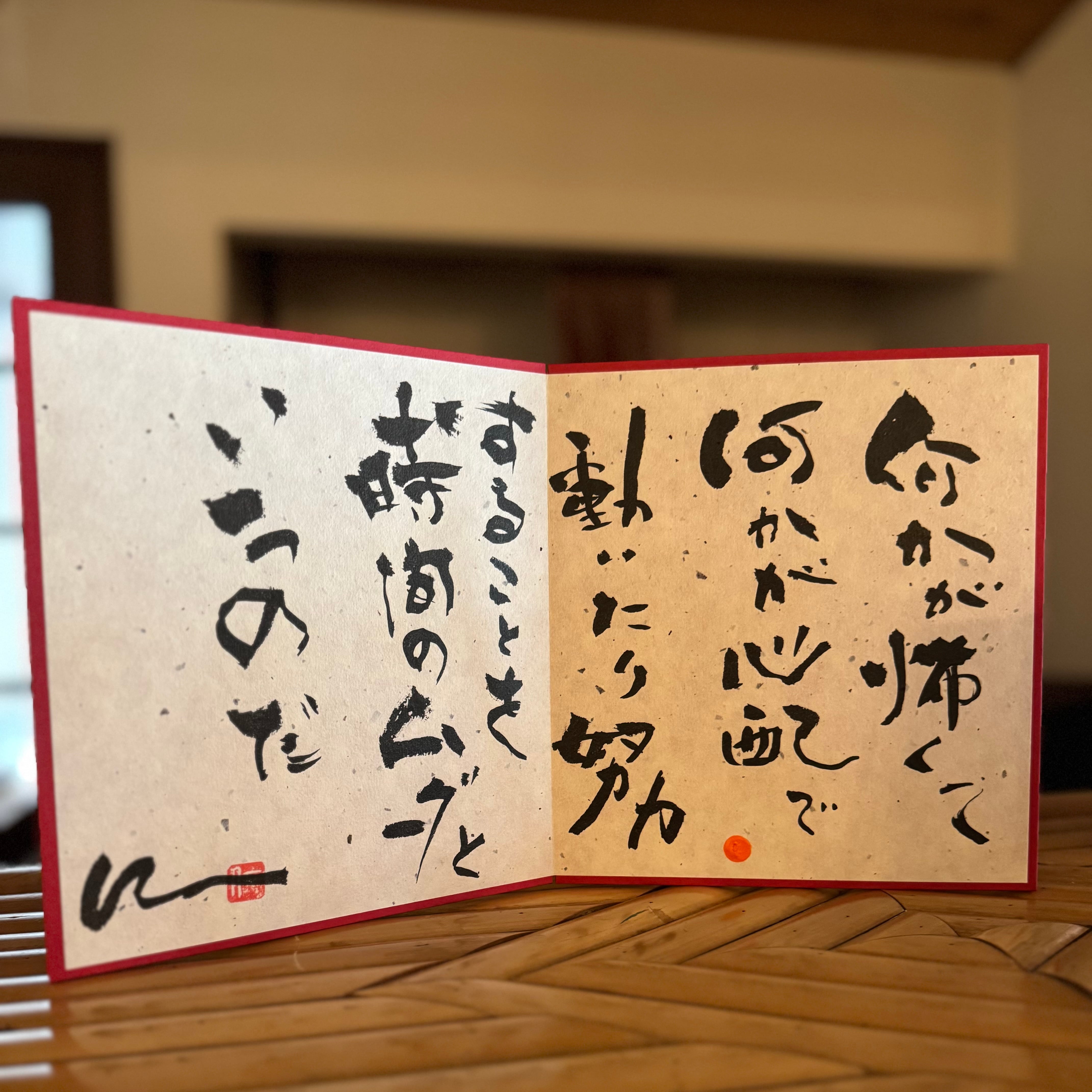 紙屏風に、Jinからあふれ出る魔法の言葉を一枚一枚手書きしています。